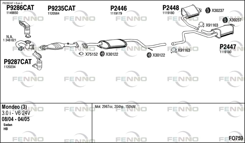 FORD MONDEO III limuzína (B4Y) 3.0 V6 24V - Výfukový systém - kompletní od 9/2004 do 3/2007, 2967 ccm, 150 kW, 204 hp, REBA, limuzína