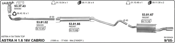 OPEL ASTRA H TwinTop (A04) 1.6 (L67) - Výfukový systém - kompletní od 9/2005 do 10/2010, 1598 ccm, 77 kW, 105 hp, Z 16 XE1, Z 16 XEP, Kabriolet