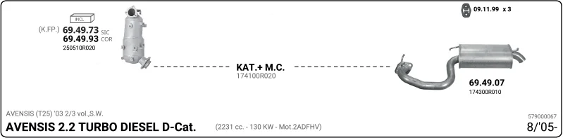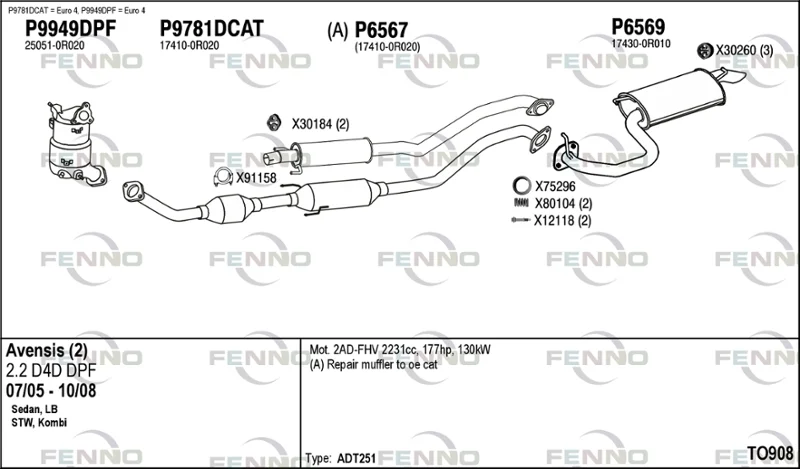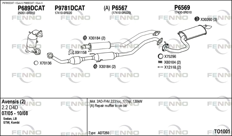 TOYOTA AVENSIS (_T25_) 2.2 D-CAT (ADT251_, ADT251R) - Výfukový systém - kompletní od 7/2005 do 11/2008, 2231 ccm, 130 kW, 177 hp, 2AD-FHV, Šikmá zadní část