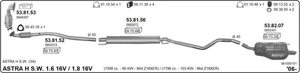 OPEL ASTRA H kombi (A04) 1.6 (L35) - Výfukový systém - kompletní od 12/2006 do 5/2014, 1598 ccm, 85 kW, 116 hp, A 16 XER, Z 16 XER, kombi