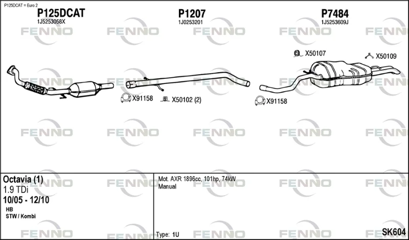 SKODA OCTAVIA I Combi (1U5) 1.9 TDI - Výfukový systém - kompletní od 8/2000 do 12/2010, 1896 ccm, 74 kW, 100 hp, AXR, kombi