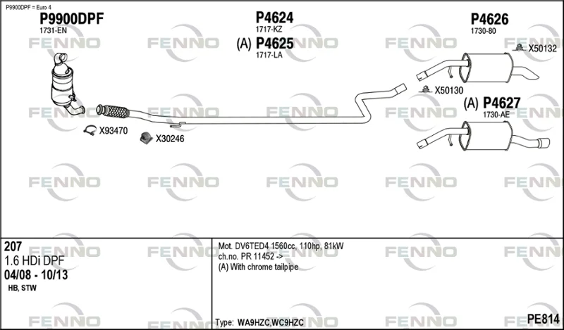 PEUGEOT 207 SW (WK_) 1.6 HDi - Výfukový systém - kompletní od 6/2007 do 12/2012, 1560 ccm, 80 kW, 109 hp, 9HZ (DV6TED4), kombi