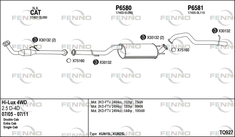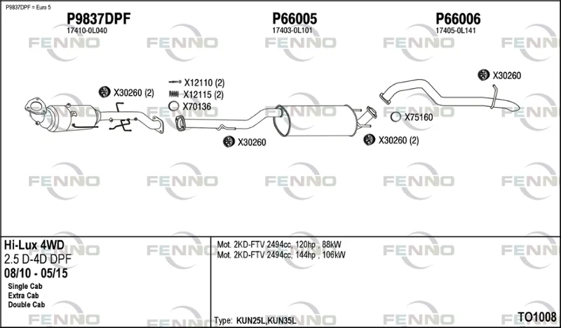 TOYOTA HILUX VII pick-up (_N1_, _N2_, _N3_) 2.5 D-4D (KUN15_, KUN15R) - Výfukový systém - kompletní od 6/2006 do 5/2015, 2494 ccm, 88 kW, 120 hp, 2KD-FTV, pick-up