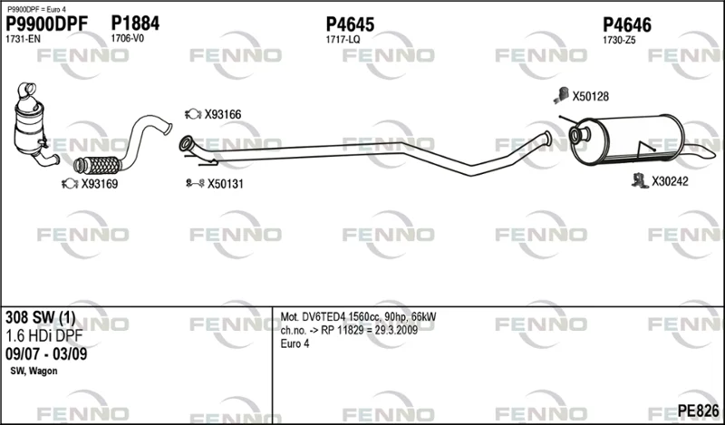 PEUGEOT 308 SW I (4E_, 4H_) 1.6 HDi - Výfukový systém - kompletní od 9/2007 do 10/2014, 1560 ccm, 66 kW, 90 hp, 9HV (DV6TED4BU), 9HX (DV6ATED4), kombi