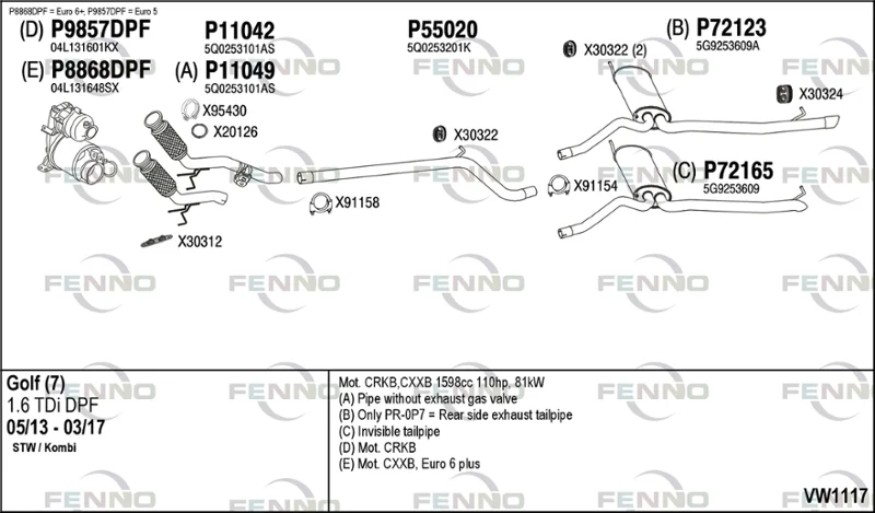 VW GOLF VII Variant (BA5, BV5) 1.6 TDI - Výfukový systém - kompletní od 5/2013 do 3/2017, 1598 ccm, 81 kW, 110 hp, CRKB, CXXB, DBKA, kombi