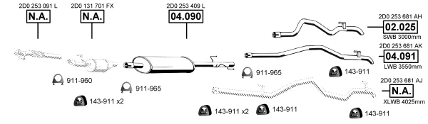 VW LT 28-35 II autobus (2DB, 2DE, 2DK) 2.8 TDI - Výfukový systém - kompletní od 1/1999 do 1/2002, 2798 ccm, 96 kW, 131 hp, ATA, autobus