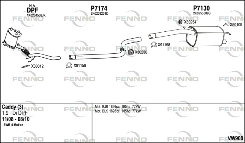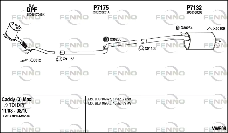 VW CADDY III velkoprostorová limuzína (2KB, 2KJ, 2CB, 2CJ) 1.9 TDI 4motion - Výfukový systém - kompletní od 5/2008 do 8/2010, 1896 ccm, 77 kW, 105 hp, BLS, velkoprostorová limuzína