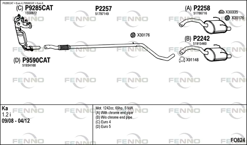 FORD KA (RU8) 1.2 - Výfukový systém - kompletní od 10/2008 do 5/2016, 1242 ccm, 51 kW, 69 hp, 169A4000, FP4, Šikmá zadní část