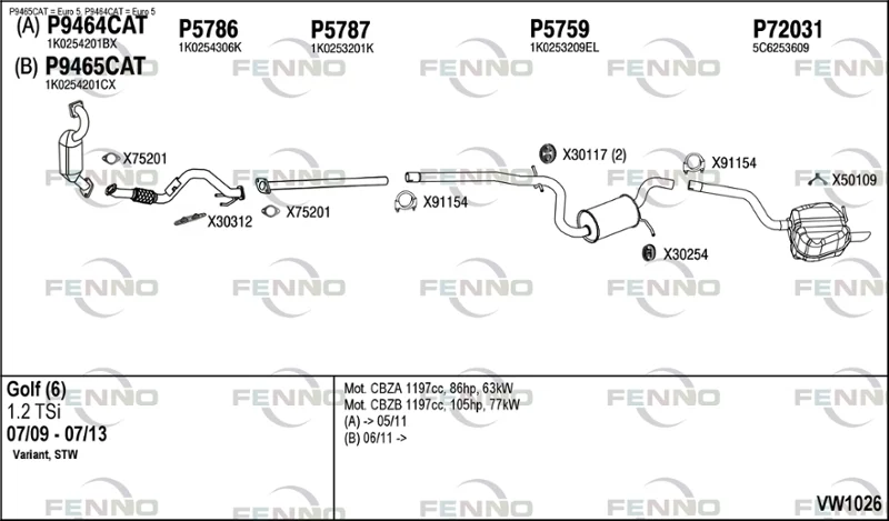 VW GOLF VI Variant (AJ5) 1.2 TSI - Výfukový systém - kompletní od 7/2009 do 7/2013, 1197 ccm, 77 kW, 105 hp, CBZB, kombi