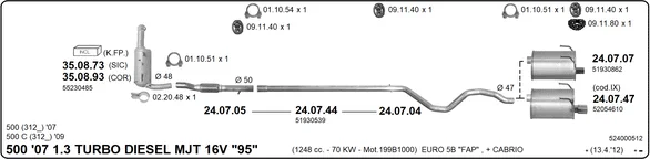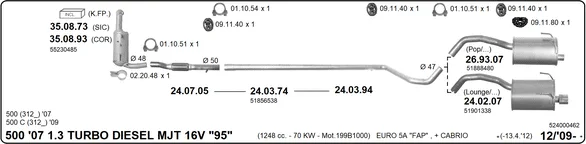 FIAT 500 C (312_) 1.3 D Multijet (312CXE1A, 312AXE1A) - Výfukový systém - kompletní od 9/2009, 1248 ccm, 70 kW, 95 hp, 199 B1.000, 312 B1.000, Kabriolet