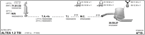 SEAT ALTEA (5P1) 1.2 TSI - Výfukový systém - kompletní od 4/2010 do 7/2015, 1197 ccm, 77 kW, 105 hp, CBZB, velkoprostorová limuzína