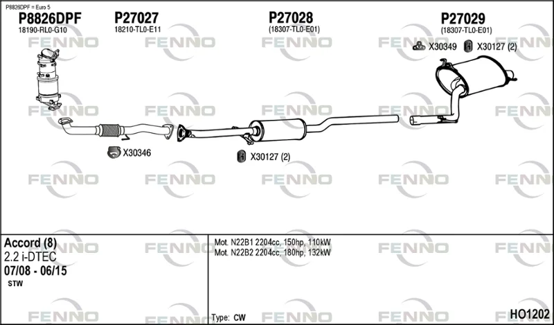 HONDA ACCORD VIII kombi (CW) 2.2 i-DTEC (CW3) - Výfukový systém - kompletní od 7/2008, 2199 ccm, 132 kW, 180 hp, N22B2, kombi