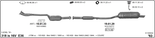 BMW 3 (E36) 318 is - Výfukový systém - kompletní od 1/1996 do 5/1998, 1895 ccm, 103 kW, 140 hp, M44 B19 (194S1), limuzína