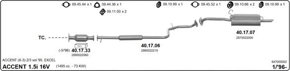 HYUNDAI ACCENT limuzína (X-3) 1.5 i 16V - Výfukový systém - kompletní od 10/1995 do 1/2000, 1495 ccm, 73 kW, 99 hp, G4FK, limuzína