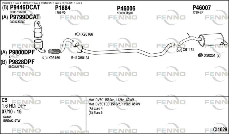 CITROËN C5 III Break (RW_) 1.6 HDi 115 - Výfukový systém - kompletní od 6/2012 do 6/2015, 1560 ccm, 84 kW, 114 hp, 9HL (DV6C), 9HR (DV6C), kombi