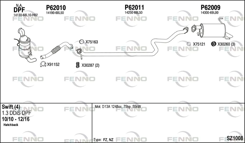 SUZUKI SWIFT IV (FZ, NZ) 1.3 DDiS (AZG413D, ZC02S, ZC92S) - Výfukový systém - kompletní od 10/2010, 1248 ccm, 55 kW, 75 hp, D13A, D13AA, Šikmá zadní část