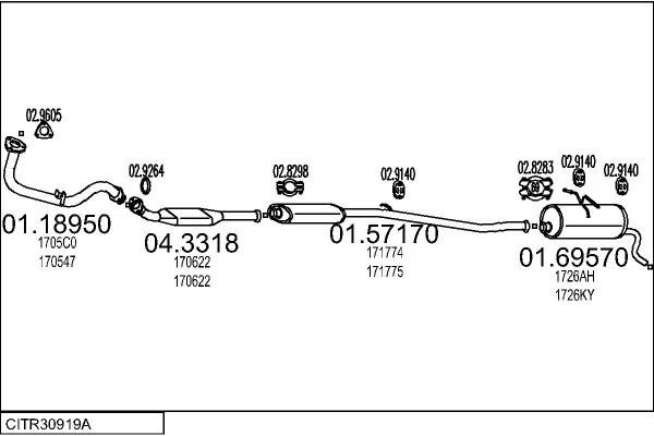 CITROËN BERLINGO / BERLINGO FIRST velkoprostorová limuzína (MF_, GJK 1.4 i (MFKFX, MFKFW, GJKFWB, GJKFWC, GFKFWC) - Výfukový systém - kompletní od 7/1996 do 12/2011, 1360 ccm, 55 kW, 75 hp, KFW (TU3A), KFW (TU3JP), KFX (TU3JP), velkoprostorová limuzína