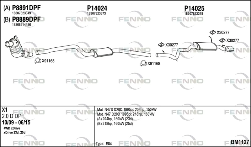 BMW X1 (E84) xDrive 25 d - Výfukový systém - kompletní od 10/2009 do 6/2015, 1995 ccm, 160 kW, 218 hp, N47 D20 D, SUV