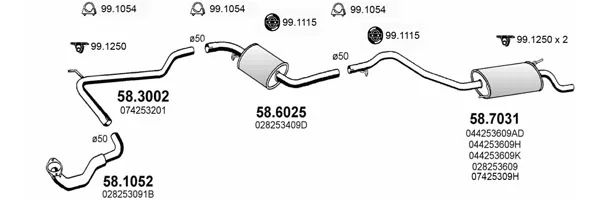 VW TRANSPORTER T4 valník/podvozek (70E, 70L, 70M, 7DE, 7DL, 7DM 1.9 D - Výfukový systém - kompletní od 7/1990 do 12/1995, 1896 ccm, 45 kW, 61 hp, 1X, valník/podvozek
