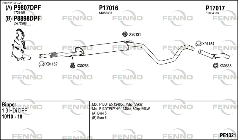 PEUGEOT BIPPER TEPEE 1.3 HDi 75 - Výfukový systém - kompletní od 10/2010, 1248 ccm, 55 kW, 75 hp, FHZ (F13DTE5), velkoprostorová limuzína