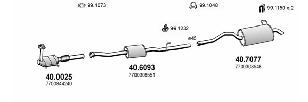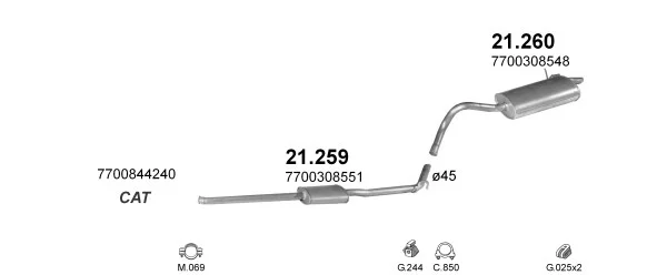 RENAULT KANGOO Express (FC0/1_) 1.4 (FC0C, FC0B, FC0H, FC0M) - Výfukový systém - kompletní od 8/1997 do 6/2008, 1390 ccm, 55 kW, 75 hp, E7J 634, E7J 635, E7J 780, K7J 700, K7J 701, Skříňová/velkoprostorová limuzína